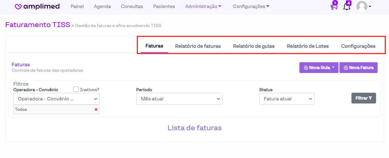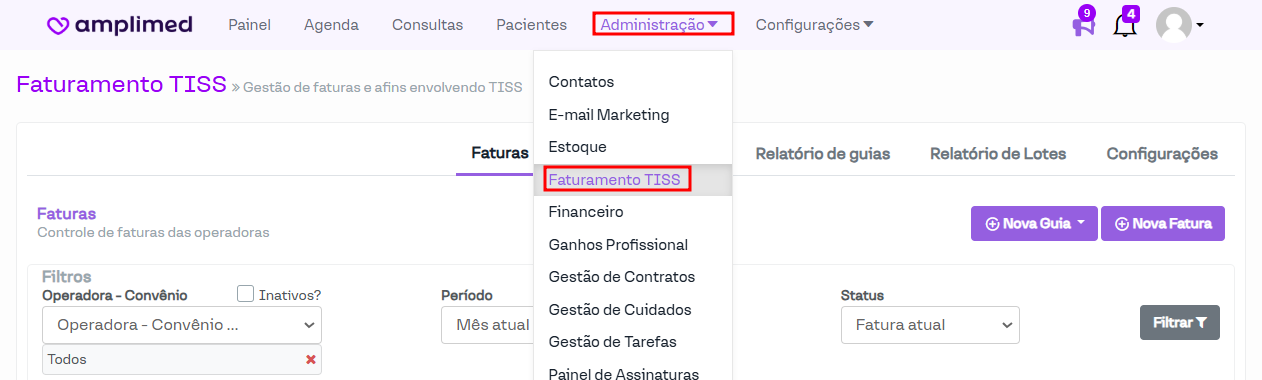 Nesta seção do sistema, é possível criar e visualizar guias e faturas. Além disso, é possível realizar algumas configurações relacionadas a essa funcionalidade.