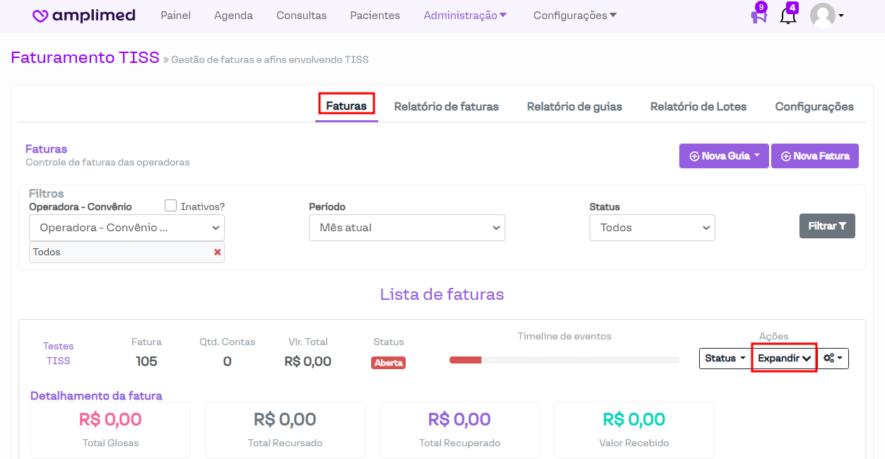 Nesta aba, é possível visualizar as faturas geradas no sistema, juntamente com suas respectivas guias. As guias podem ser acessadas ao expandir a fatura selecionada.