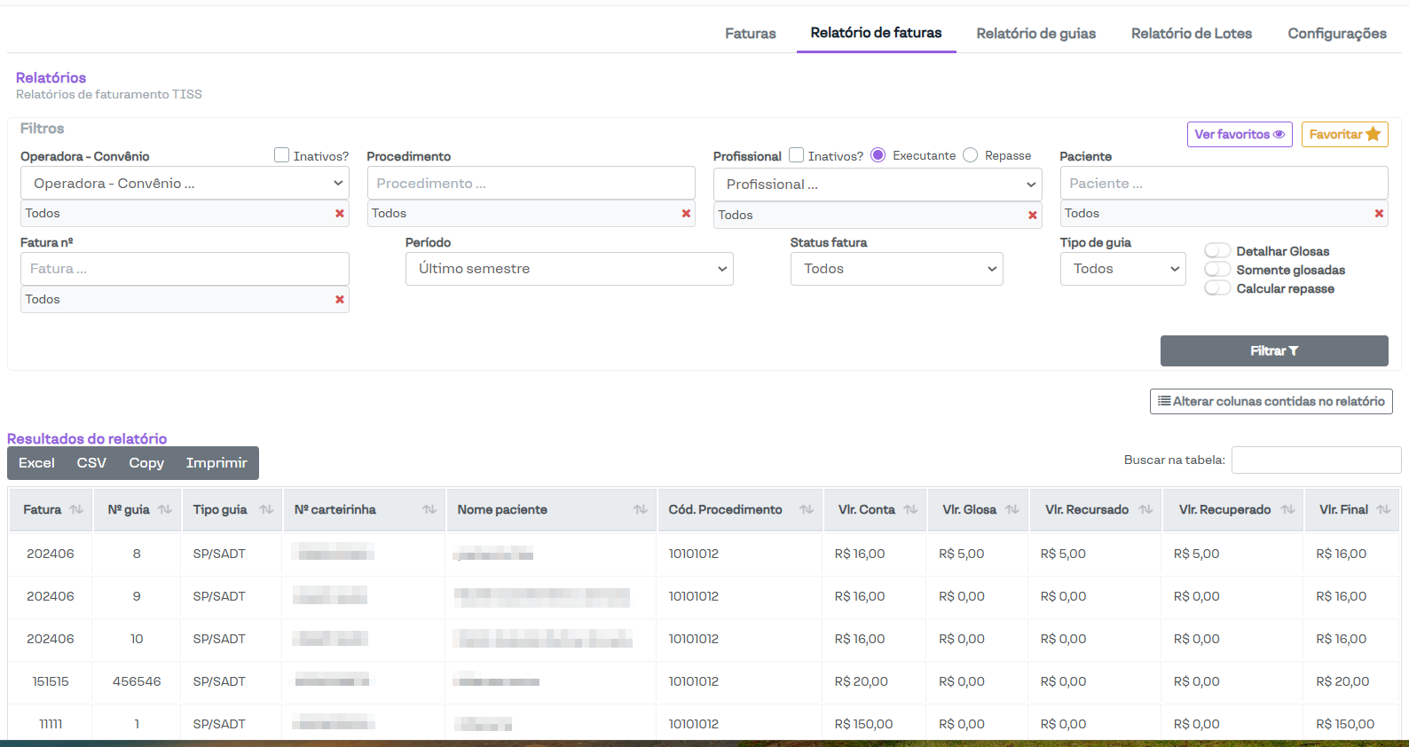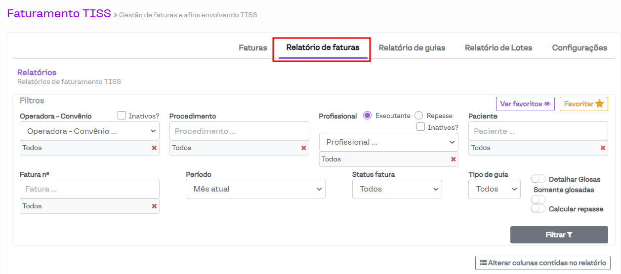 Vale destacar que, no Relatório de Faturas, serão exibidas apenas as guias com o status Finalizada, pois as guias apresentadas nesse relatório devem fazer parte de uma fatura.