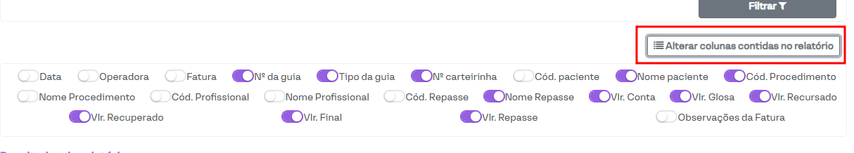 Alterar colunas contidas no relatório: Permite visualizar informações adicionais na tabela de exibição das guias filtradas.