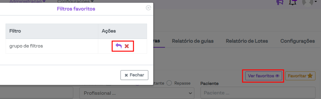Ver favoritos: Permite gerenciar os grupos de filtros pré-cadastrados e aplicá-los na geração do relatório de faturas. Para aplicar os filtros, basta clicar no ícone de seta. Para excluir um grupo de favoritos, clique no ícone em formato de "x" conforme imagem abaixo.