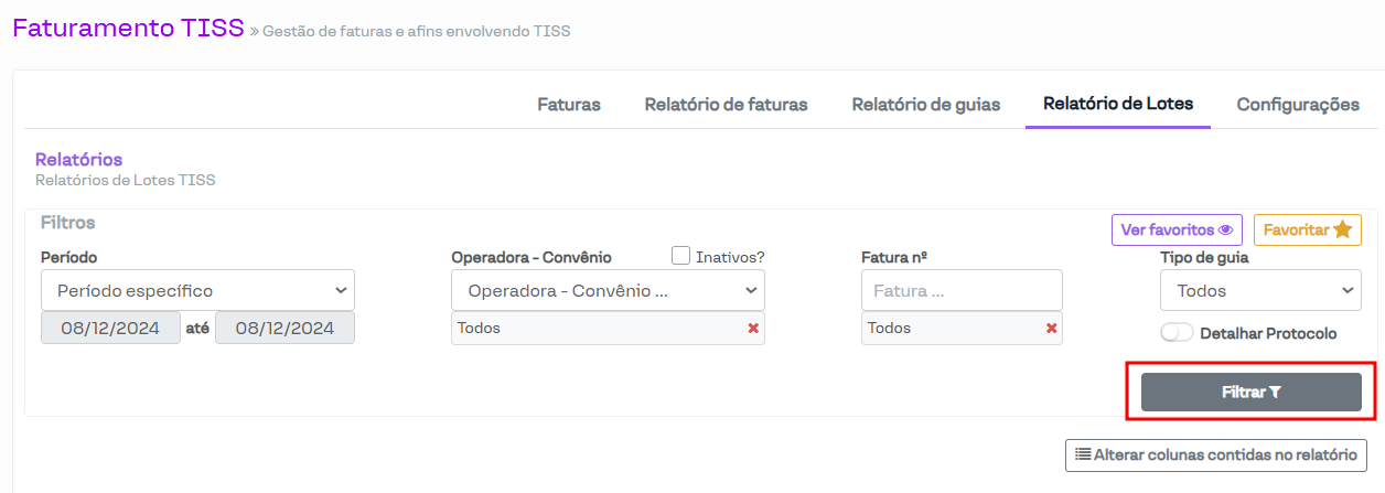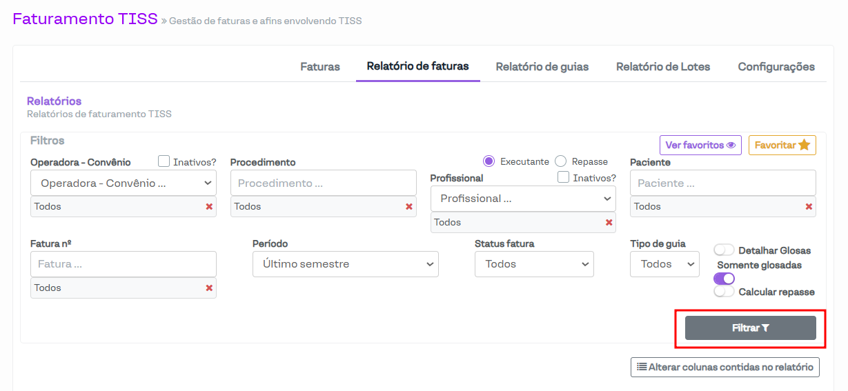 Por fim, após selecionar os filtros desejados, basta clicar no botão Filtrar e o relatório será gerado.