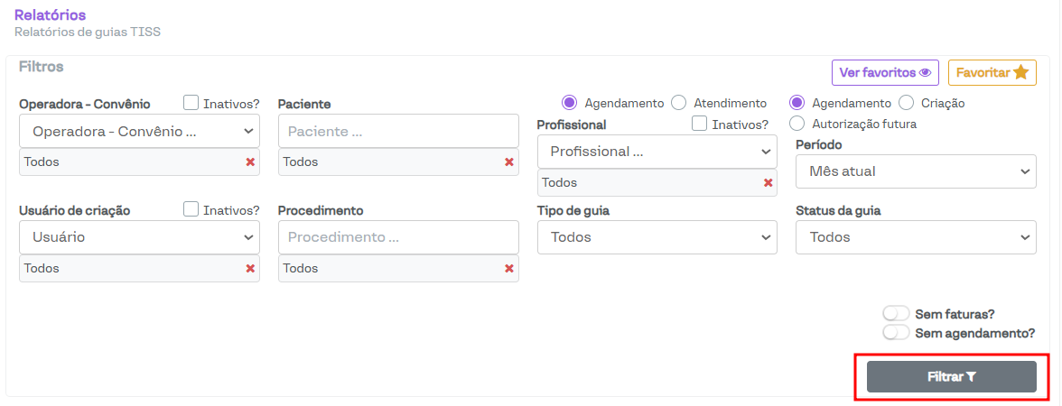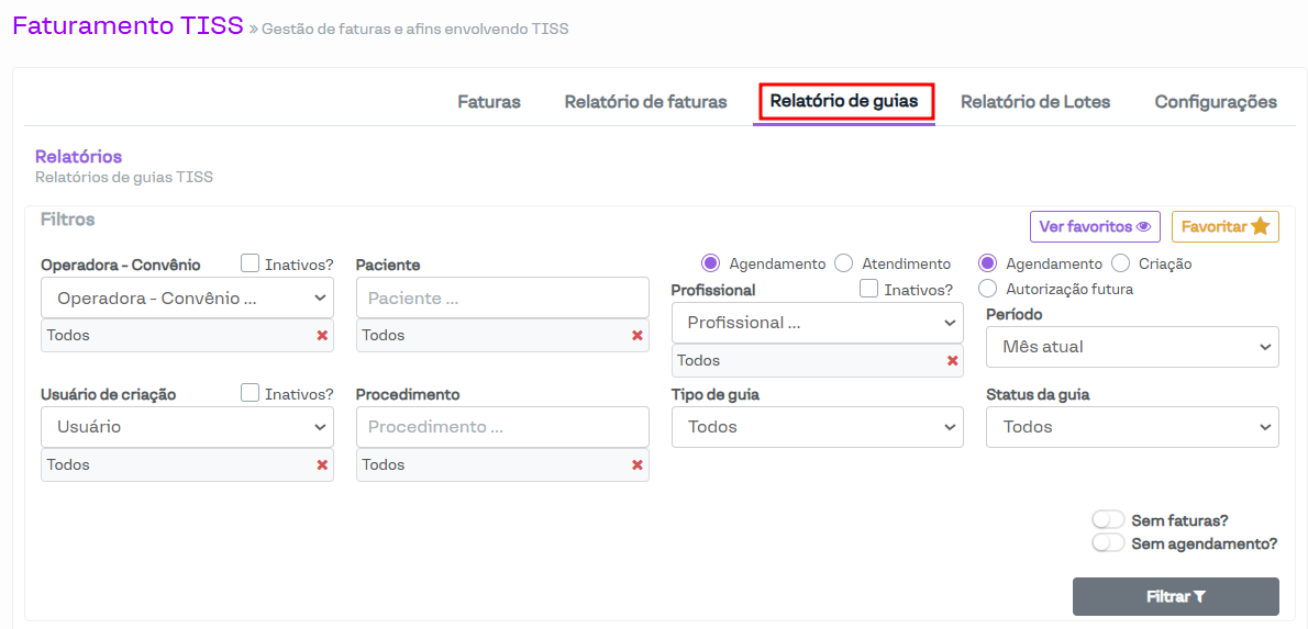 Sem agendamento?: Permite filtrar guias criadas diretamente no Faturamento TISS ou através da aba Exames do prontuário, as quais não ficam vinculadas a agendamentos.