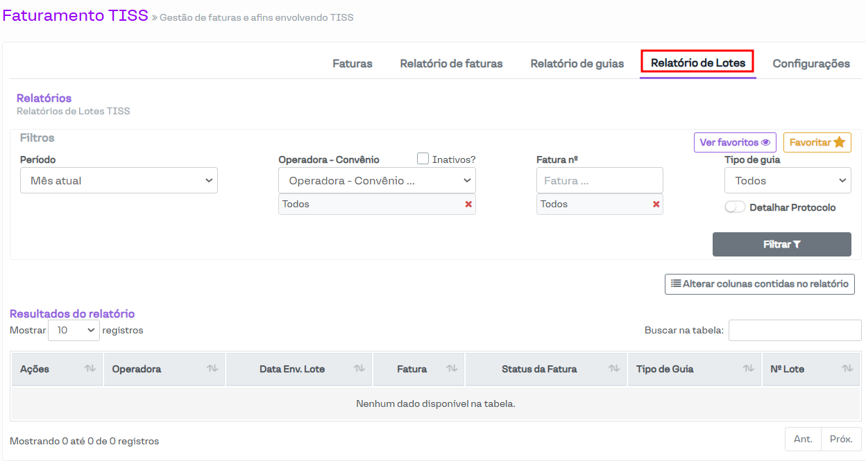 Nesta parte do sistema, é possível gerar um relatório dos lotes gerados. Esses lotes são criados após uma fatura estar no status Fechada e o arquivo XML ser gerado.