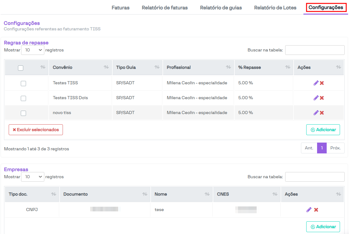 Nesta seção, são listadas as empresas cadastradas, que podem ser selecionadas no momento da criação de uma guia TISS dos tipos Honorários e Internação.