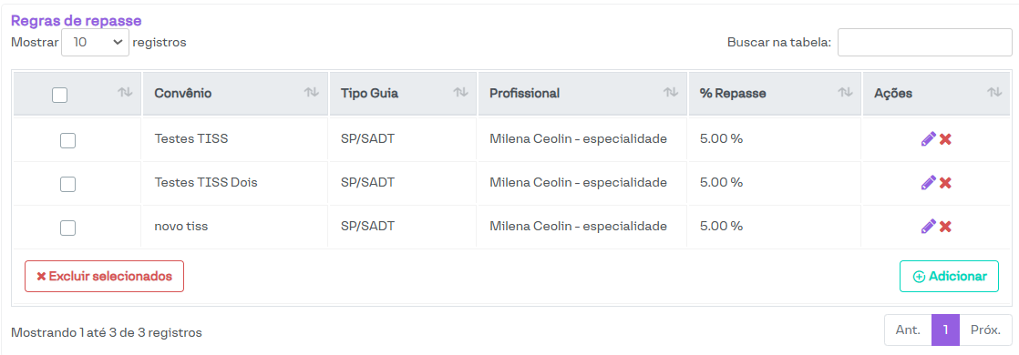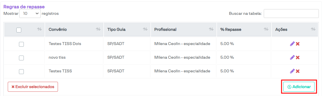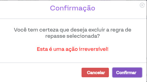 Nesta seção, é possível visualizar e gerenciar as regras de repasse cadastradas, além de adicionar novas regras.