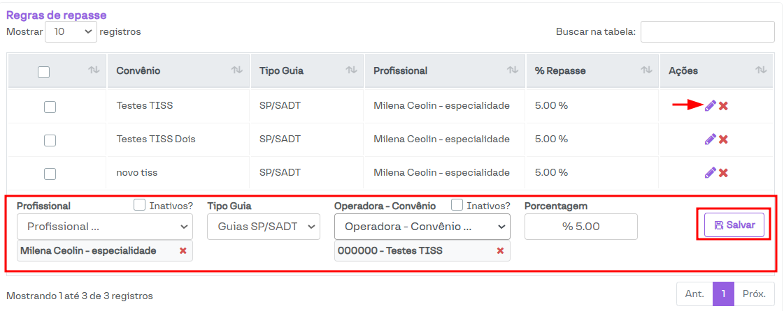 Para editar as regras já criadas, basta clicar no ícone em formato de lápis, o que habilitará os campos para edição. Após realizar os ajustes desejados, clique no botão Salvar.