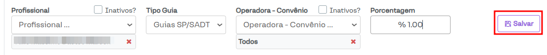 Profissional: É possível selecionar o profissional executante ou o profissional de repasse, alterando as opções localizadas acima do campo. Além disso, ao marcar o campo Inativos?, é possível selecionar profissionais que já foram desativados na clínica como filtro nas buscas das guias.