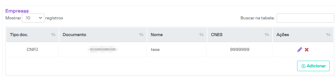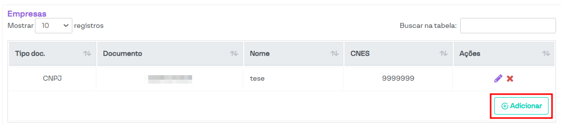 Para criar uma nova empresa, basta clicar no botão Adicionar.