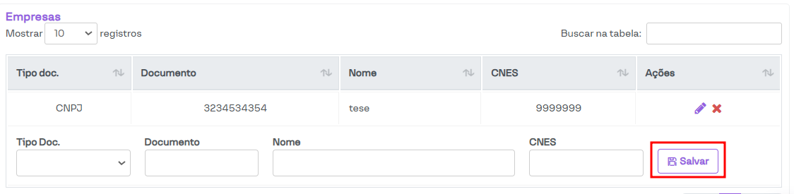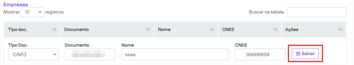 Em seguida, os campos para preenchimento serão habilitados (da mesma forma que ocorre na edição das empresas). Após preencher os campos, basta clicar no botão Salvar.