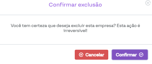 Ao clicar no botão de excluir, aparecerá uma mensagem de confirmação. Basta clicar no botão Confirmar para prosseguir com a ação.