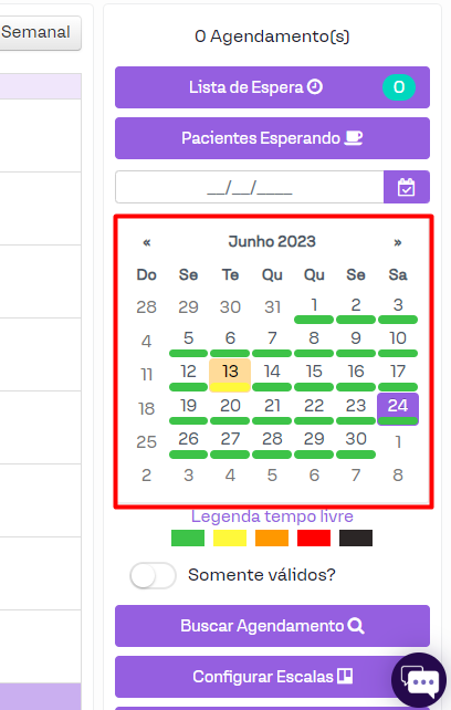 Além de ser possível visualizar todos os profissionais que atendem no dia de hoje, agora é possível ver todos de determinada data, para isto é bem simples, abra a agenda e no calendário troque para o dia desejado, neste caso clicarei no dia 24/06/2023: