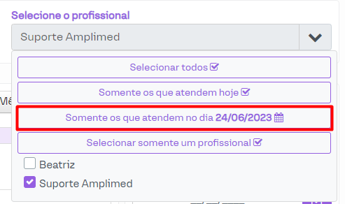 Após isto em Selecione o profissional clique na opção Somente os que atendem no dia 24/06/2023 por exemplo: