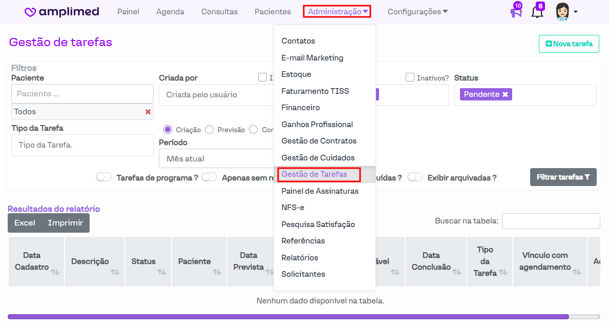 As tarefas funcionam como lembretes, como, por exemplo: "agendar retorno" ou "ligar para o paciente". A Gestão de Tarefas organiza essas atividades e fornece dados sobre o progresso de sua execução.