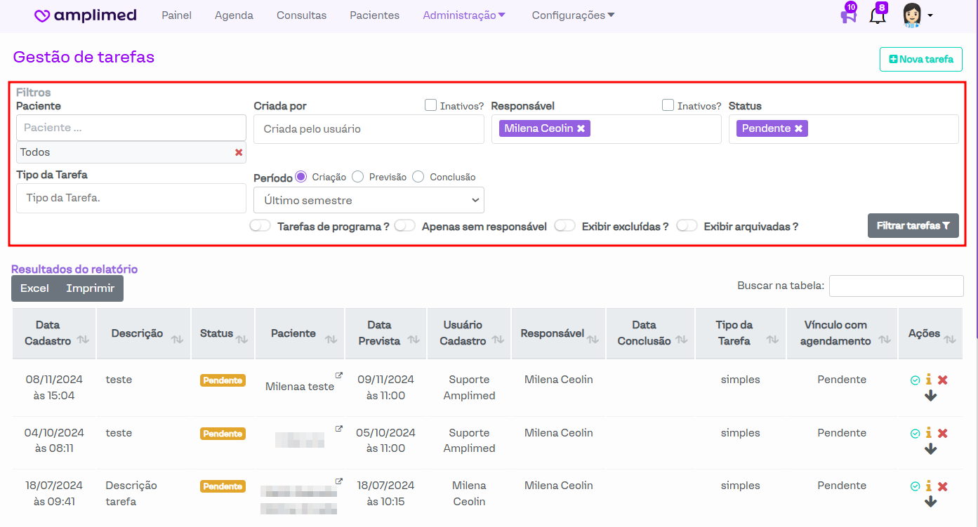 Paciente: Permite filtrar as tarefas de acordo com o paciente vinculado a elas. Caso a tarefa tenha sido criada sem um paciente, ela não será exibida com esse filtro selecionado.