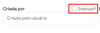Criada por: Permite filtrar as tarefas de acordo com o usuário que as criou. Ao clicar no ícone Inativos?, localizado no canto superior direito do campo, é possível selecionar usuários inativos.