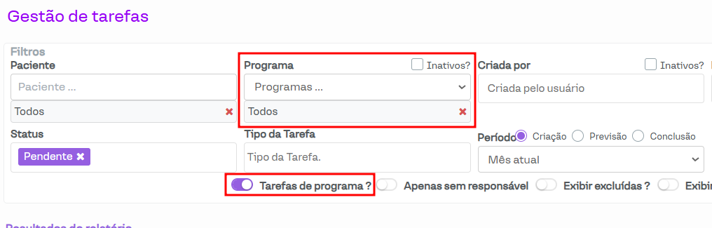 Tarefas de programa?: Permite filtrar tarefas que fazem parte de programas, como gestão de cuidados ou plano terapêutico. Ao selecionar essa opção, será habilitado o filtro Programa, que permite filtrar as tarefas de acordo com o programa selecionado.