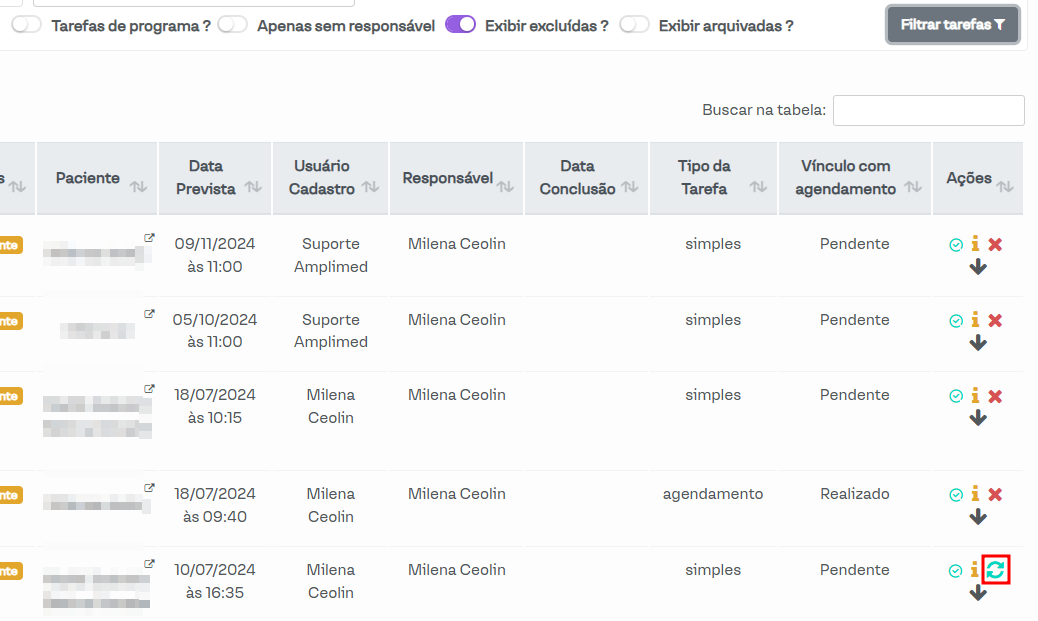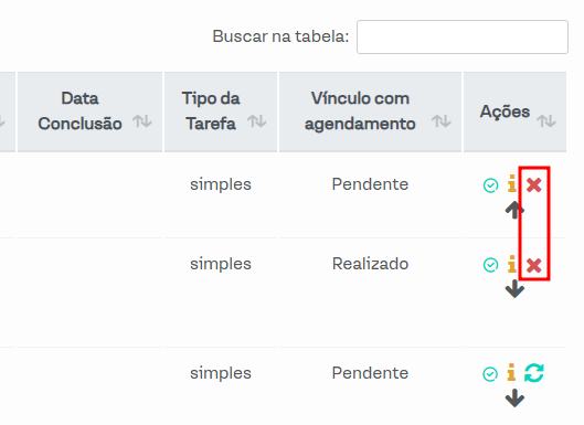 Ao clicar no ícone em formato de "X", é possível remover a tarefa. Contudo, ela ainda permanecerá no sistema, e caso seja necessário buscá-la, basta ativar o filtro de Exibir excluídas.