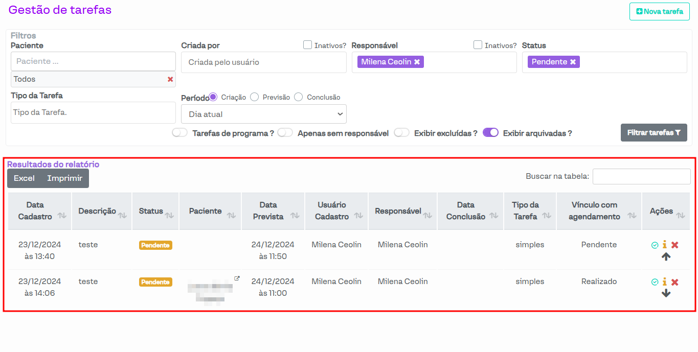 Com esse campo ativo, serão exibidos também os usuários que foram desativados no sistema, permitindo localizar as tarefas criadas por esses usuários.