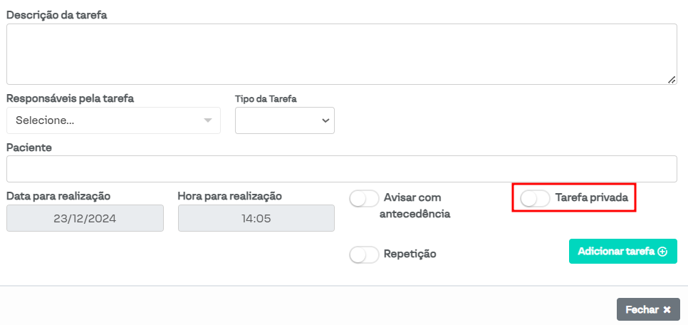 Vale ressaltar que, se uma tarefa for marcada como privada no momento da criação, apenas o usuário que a criou e o responsável poderão visualizá-la no sistema.