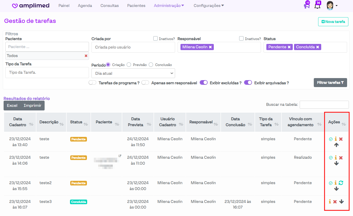 O usuário responsável pela tarefa pode realizar as ações disponíveis na coluna Ações na listagem de tarefas, conforme destacado na imagem a seguir.