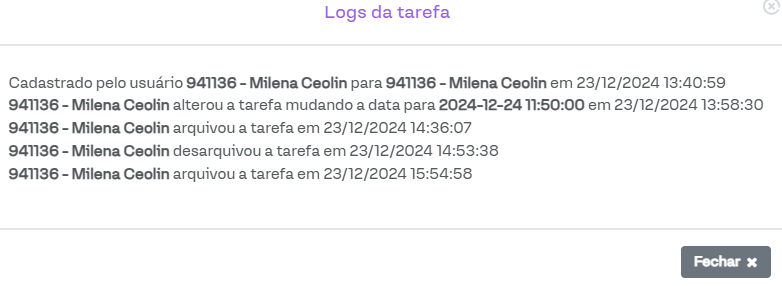 Ao clicar no ícone em formato de "i", é possível visualizar o histórico de ações da respectiva tarefa.